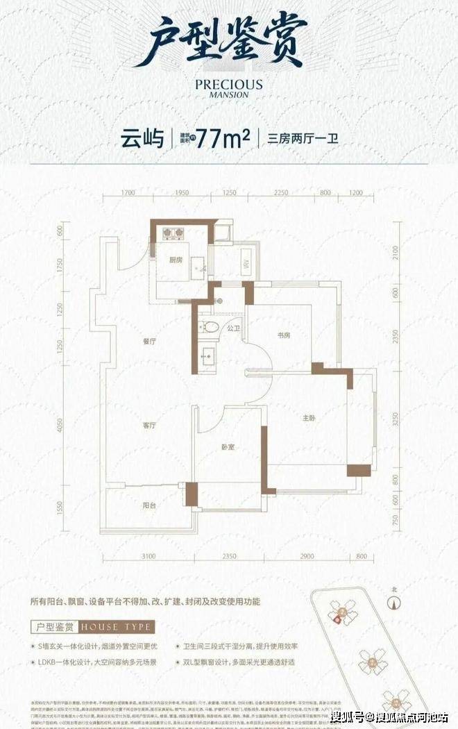 77㎡-3房2厅1卫,设计的是经典竖厅格局,客厅3.3开间,LDKB一体化,S墙设计预留冰箱卡槽位,动静分区,三开间朝南,U型厨房,卫生间三段式分离,还带1个设备平台,得房率约88.34%(包含赠送),西南朝向。