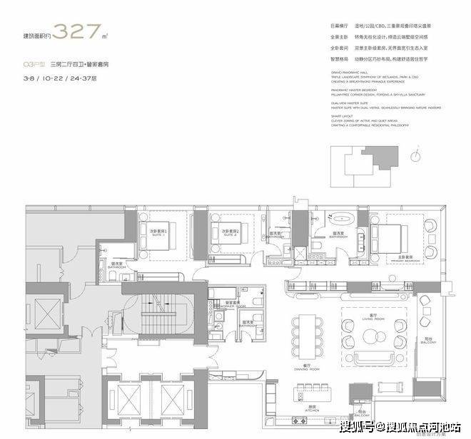 【梯户比】:5梯6户主力户型:公寓主力户型为303㎡、326㎡、404㎡、572㎡等大平层,最大户型达1000㎡