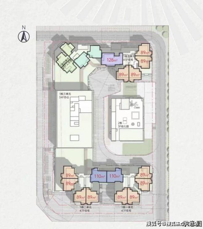 从平面图可以看出住宅均为每层5户的布局,1栋1、2单元为47层住宅,1栋5单元为45层住宅,1栋4单元为41层人才房,1栋3单元为34层写字楼,2栋为3层幼儿园。