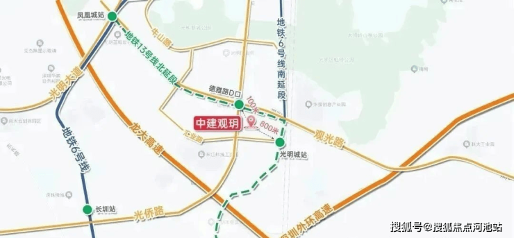 光明城片区在建的13号线二期北延同观路站一路之隔!