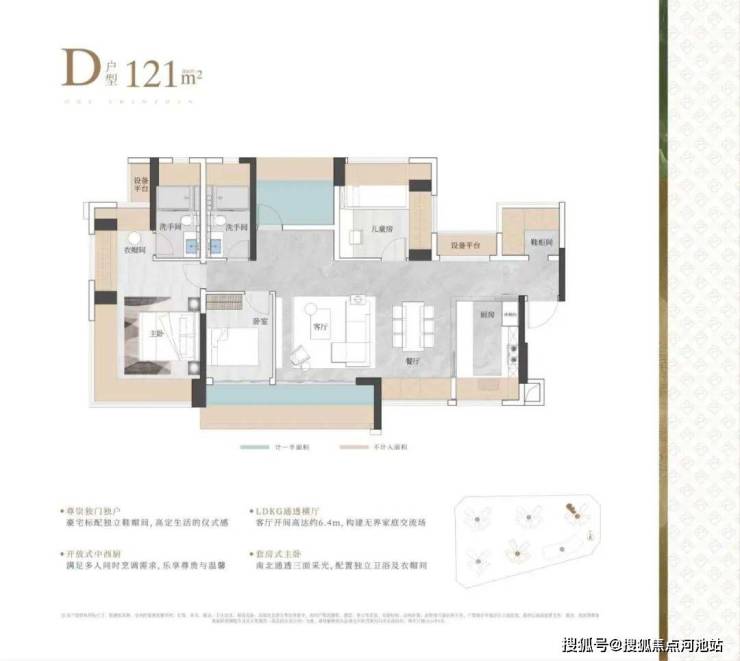 实际使用率(含赠送)在95%左右,相比建筑老规设计,得房率高了10%。79㎡就能做到三房二卫,89㎡能做到四房二卫,99-119㎡四房二卫。