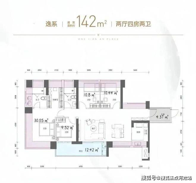 142㎡的4房2厅2卫,2栋1/2/3单元02户型,设计的是横厅南北通透格局,独门独户,赠送约4.37平的入户空间,客餐厅7.3米开间,LDKB一体化设计,五开间朝南,主卧带大衣帽间,分别做到了主卧30.05㎡/次卧10.8㎡/次卧10.44㎡/次卧9.52㎡(包含墙体飘窗),客厅连接次卧出6.9米长的大阳台约12.42平,U型厨房,卫生间干湿分离,得房率约104.2%(包含赠送),西南或东南朝向。飘窗赠送面积23.8㎡+阳台赠送6.21㎡+外廊赠送4.37㎡=实际赠送34.38㎡。