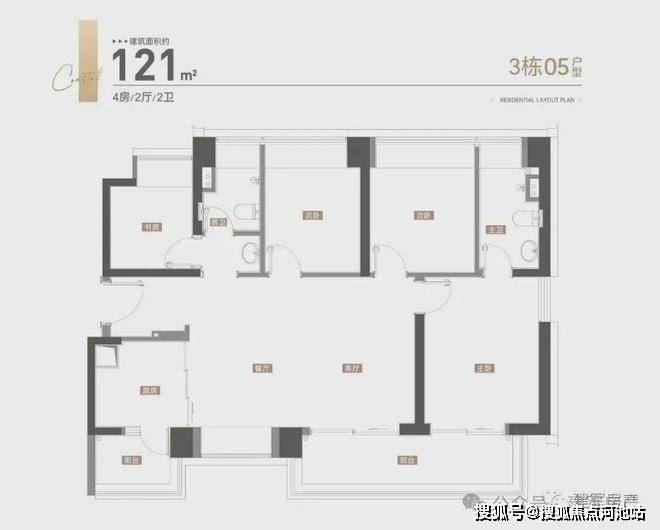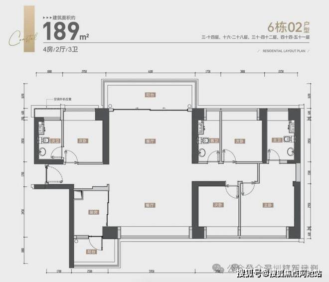 01户型142平4房2卫,02-03户型188平4房3卫,为楼王单位,层高3.15米,3梯3户。