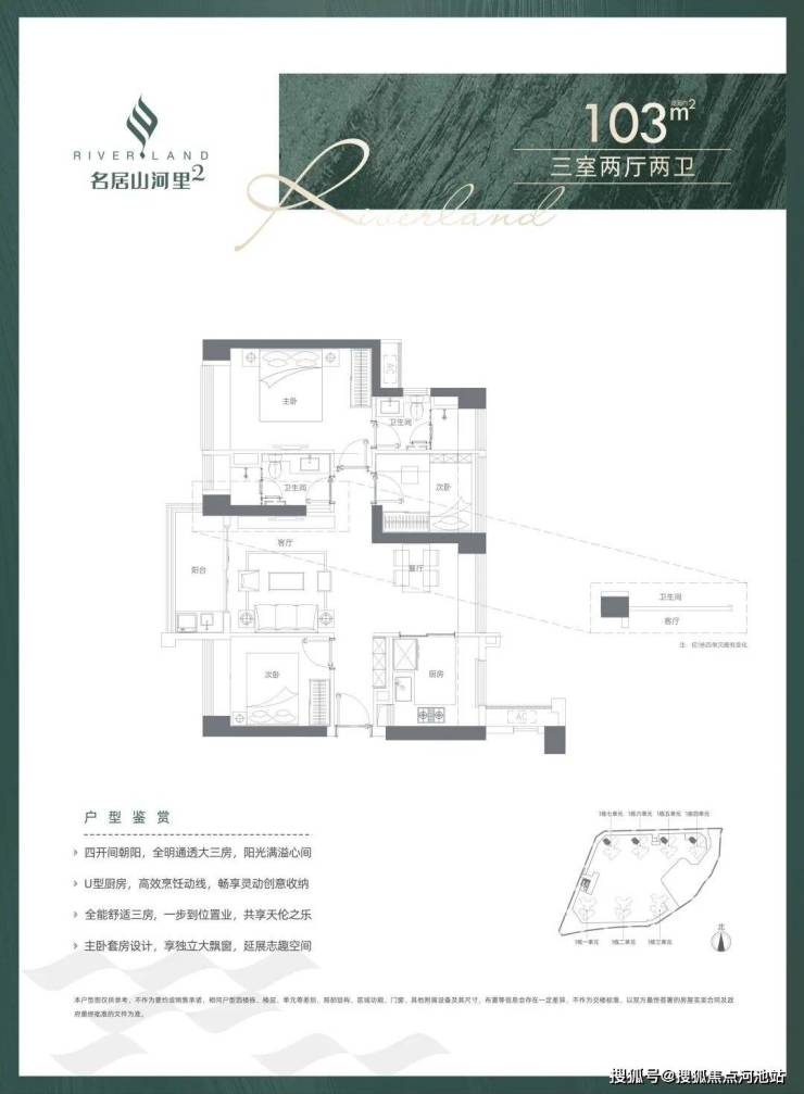 103㎡的3房2厅2卫(02户型),设计的是竖厅南北通透格局,客厅3.5米开间,四开间朝南,全屋飘窗,U型厨房,得房率:73.87%(不含赠送),阳台1.6米进深,主朝西南向。
