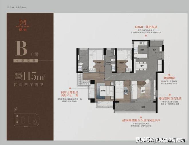 115㎡四房二卫A/B户型,大阳台,主卧通过凸窗赠送衣柜,但次卧尺度都偏小。
