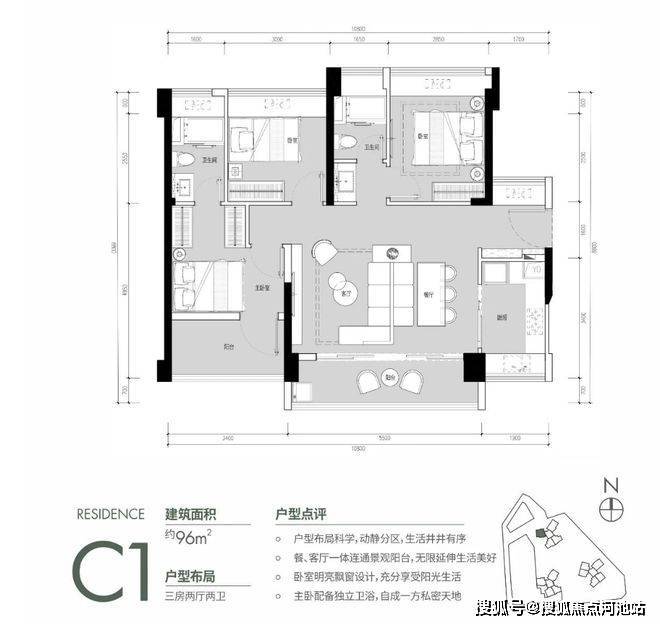 约96㎡户型的空间尺度进一步拉伸,且都是朝南的。
