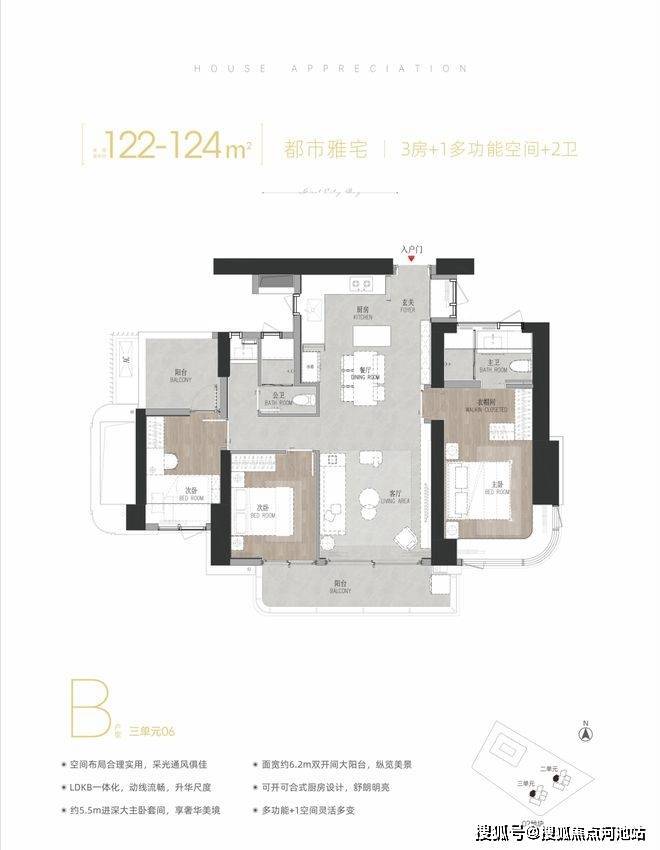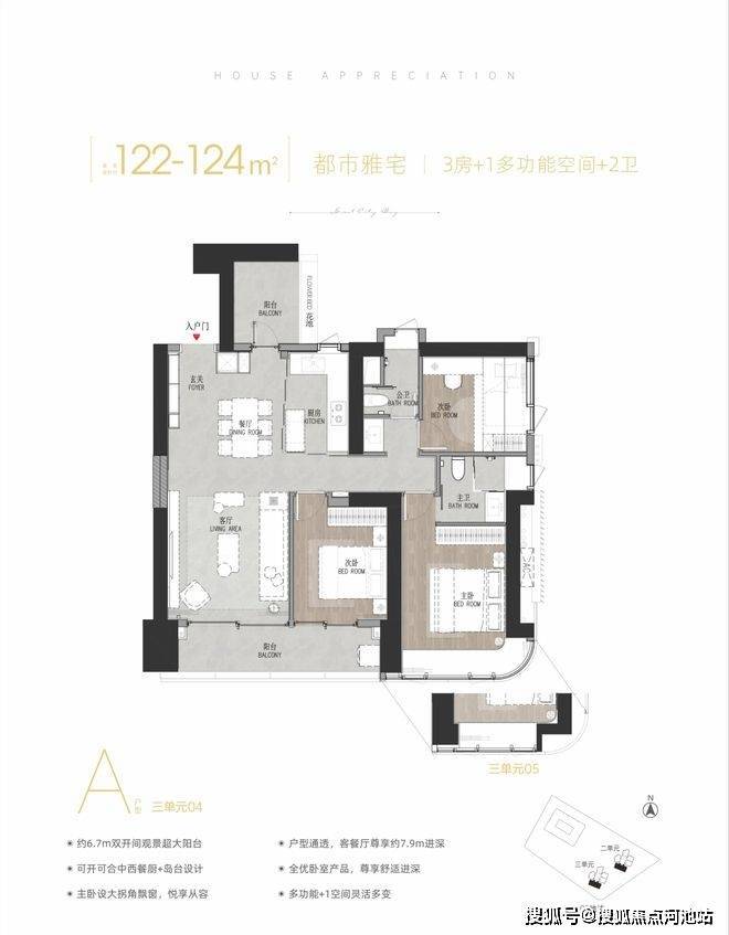 122-124㎡3+1房2厅2卫,有竖厅、横厅和双龙抱珠户型,跟之前03地块户型完全一致。
