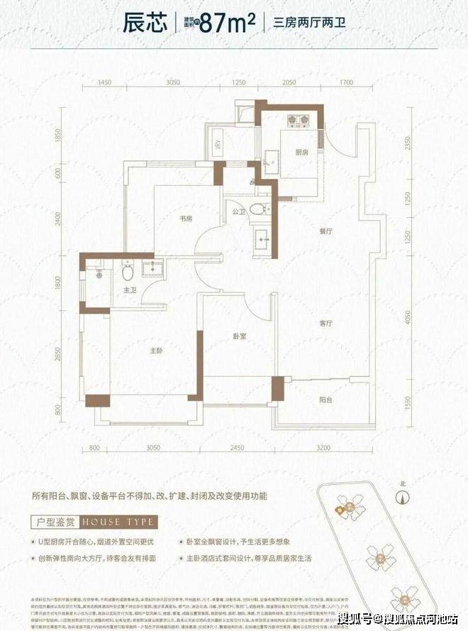 87㎡的3房2厅2卫,设计的是经典竖厅格局,进门入户玄关,客厅3.4米开间,LDKB一体化,S墙设计预留冰箱卡槽位,动静分区,三开间朝南,U型厨房,公卫三段式分离,还带1个设备平台,西南朝向。