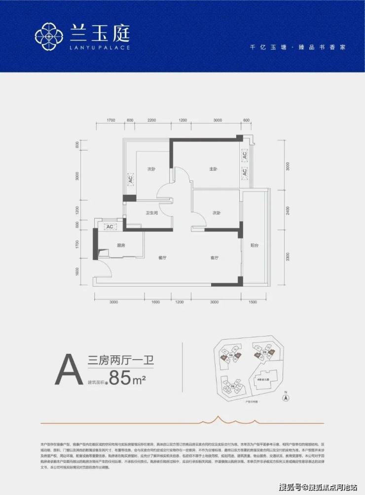 85㎡的3房2厅1卫,A户型,设计的是竖厅格局,客厅开间3.3米,LDKB一体化,三开间朝南,3个卧室分别做到了3米/2.8米/2.4米的宽度,客厅连接次卧出5.7米长的大阳台,L型厨房,得房率约79%(不含赠送),西南或东南朝向。