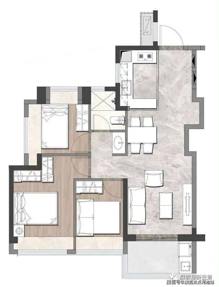 约79㎡三房一卫是是传统竖厅三房结构,同样具有低总价优势,除厨房和小卧室外,其它功能间都是优势朝向。需要注意的是小卧室虽然不是优势朝向但是双面采光双飘窗的。