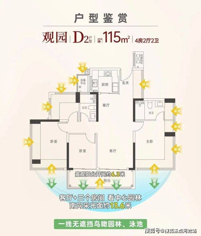 115㎡4房2卫户型:接近360°采光。双龙抱珠的格局下,两间卧室分置客厅两侧,使得三代同堂各享私密空间,不同家庭成员之间互不干扰、各自完整。