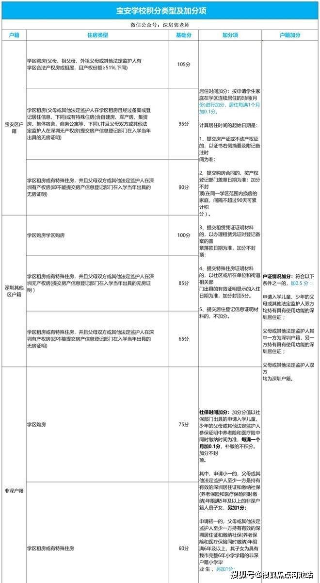 按照宝安区教育局公布的积分政策,只要是深圳户籍(其它区)+学区内商品房,基础分100分深圳宝安户籍+学区内商品房,基础分105分