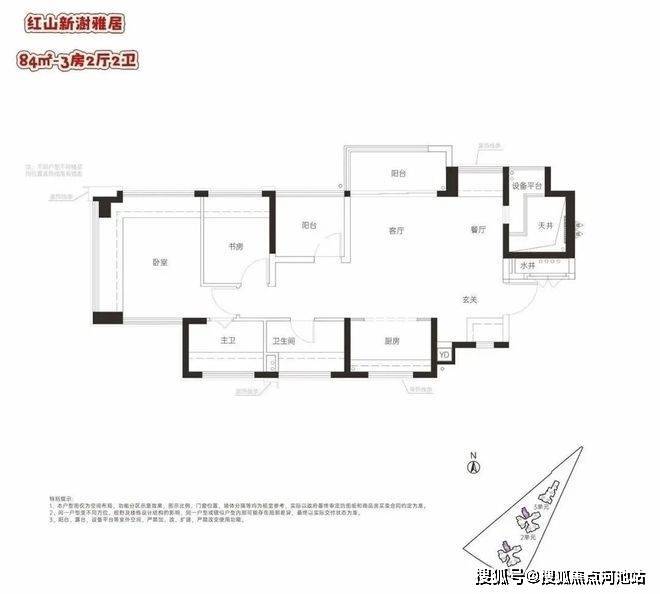 84㎡的3房2厅2卫,设计的是横厅南北通透格局,客厅3.4米开间,LDKG+X空间一体化,动静分区,主卧南北通设计,餐厅位带1个设备平台,U型厨房,卫生间干湿分离,得房率:100%(包含赠送),阳台东北朝向。
