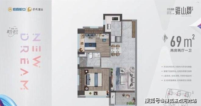 69㎡的2房2厅1卫设计的是竖厅格局,客餐厅一体化,L型厨房,得房率:70.9%(不含赠送),阳台西南朝向。