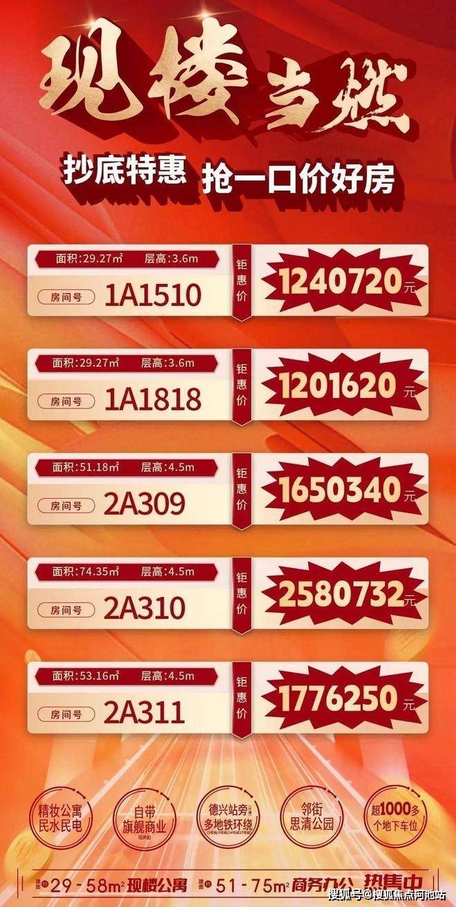 1A座14-26层,层高3.6米的双享空间公寓,建面约29㎡的现楼真公寓(只带精装无软装家私),单价约38000元/㎡起、总价约125万元起,交付时间为办完购房手续即可交房。