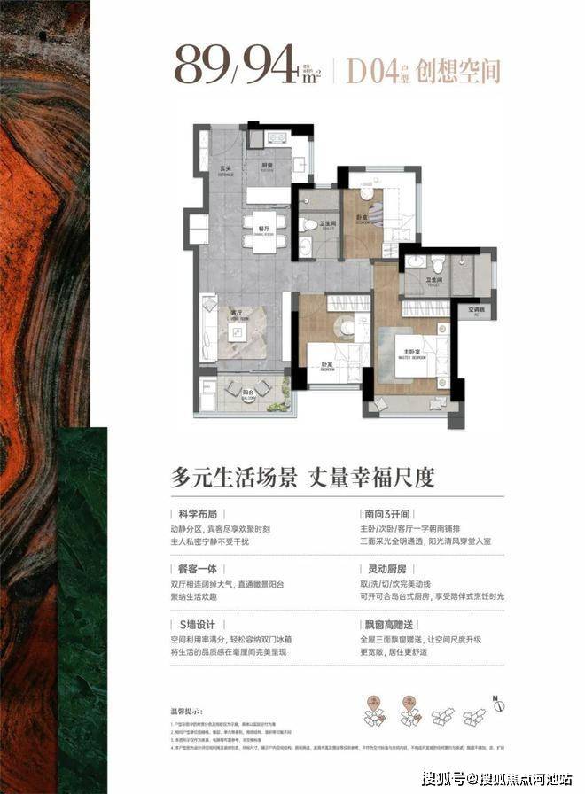 89-94㎡的4房2厅2卫,03.04户型,设计的是经典竖厅格局,进门入户玄关,客厅实测3.245米开间,LDKB一体化,S墙设计预留冰箱卡槽位,三开间朝南,3个卧室分别做到了主卧13.76㎡/次卧8.28㎡/次卧7.74㎡(实测面积,不含墙体),U型灵动式厨房,卫生间干湿分离,得房率约76-81%(不含赠送),东南朝向。