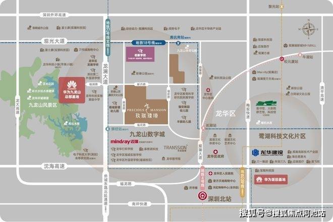 九龙山数字城坐拥龙澜智造与梅观创新产业走廊北部核芯节点,规划约22.77平方公里,超70万㎡华为九龙山总部基地落子于此,2公里内已聚集迈瑞医疗、富士康、传音控股等龙头企业。