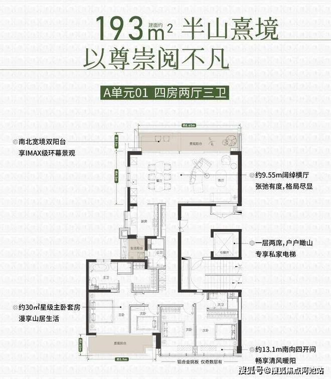 项目全是南北通透的设计,每个卧室都有一个大飘窗,基本是开间有多宽,窗就有多宽。该户型属于改善群体的顶级需求,专梯入户四房三房大户型三阳台,最长那个有8.65米,餐客厅开间9.55米