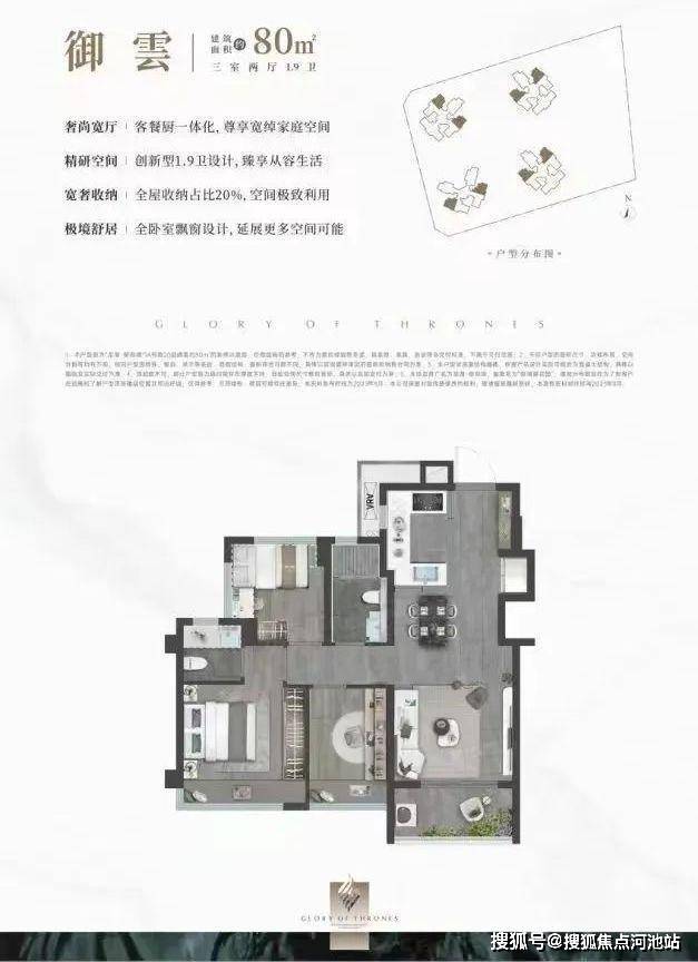 80㎡的3房2厅1.9卫,得房率:78.99%(不含赠送),有西北、西南、东北、东南4个朝向。