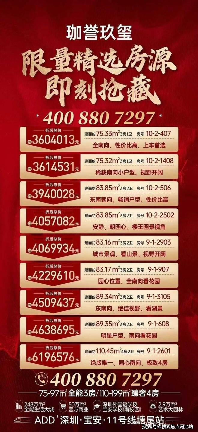 鸿荣源34载豪宅经验,打造前海鸿荣源中心、宝中壹方玖誉、香蜜湖熙园等城市名片,所到之处,必树标杆!鸿荣源上一个“玖”系产品壹方玖誉,就是宝安中心的经典之作,不仅占据着宝中核心的商业、地铁配套,而且现在二手挂盘价也是在片区遥遥领先,和周边楼盘有2万的价差,可以说鸿荣源“玖”系产品就是代表区域最中心的地段、最全面的配套、最优质的产品,也是房子保值增值的代言词。从首推124-199㎡的火爆成绩就能印证,珈誉玖玺一战而定,现在就是西部改善置业项目的新标杆,而此次即将入市的75-97㎡3房全新产品,将是您入主玖蟹的最佳机会!