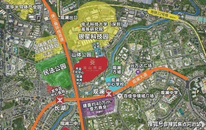 溪山禾玺御府所在的金光华溪山禾玺项目规模较大,整体东南向沿观澜河布局,与观澜古墟历史文化街区一河之隔;西南向毗邻梅观大道及深圳民法公园;北向背靠山体公园,与银星科技园、迈瑞医疗龙华基地(建设中)等重磅产业园相近。周边业态丰富,龙华区中心医院、观澜体育中心(建设中)、约40万㎡壹方天地旗舰商业(建设中)等优质配套设施环伺。