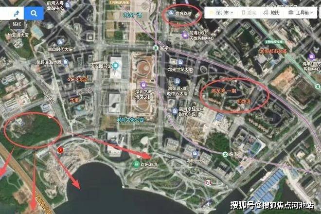 如果你驾车在广深沿江高速深圳去广州方向,在海上往东看过欢乐港湾摩天轮和前海桂湾的景观,你就能懂了。下图左边第二个绿色地块就是观潮地块。