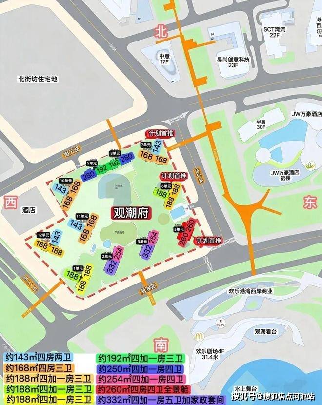 观潮的起步面积是143平4房2卫,中间有168、188的,还有260和330的大平层,同时还有500平的顶层penthouse。