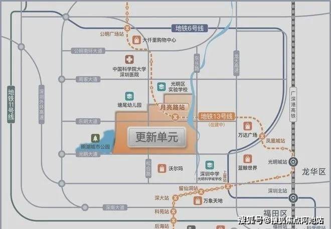 该片区更新单元拥有正在建设的轨道快线13号线贯穿其中,是13号线月亮路站的TOD大型城市综合体。居民从月亮路站出发,仅需一站即可抵达凤凰城站,轻松换乘6号线,快速通往福田中心。此外,三站即可到达重要的轨道枢纽——光明城站,乘坐高铁,便可迅速抵达深圳北、福田等核心区域。