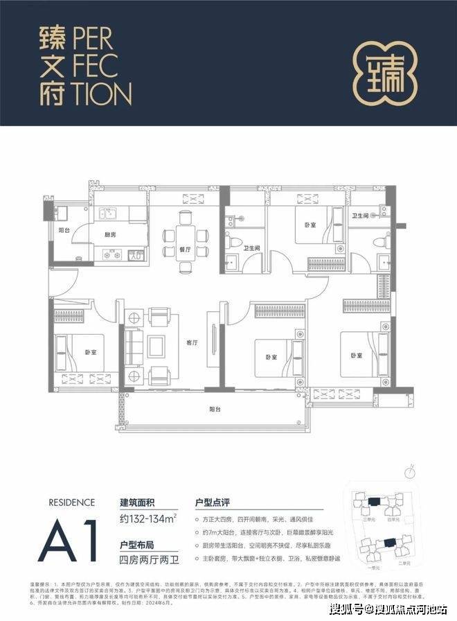 132㎡的4房2厅2卫,设计的是竖厅南北通透格局,一体化客餐厅,四开间朝南,全屋飘窗,客厅连接次卧出7米长的大阳台,主卧大套房设计,二字型厨房还带1个小生活阳台,卫生间干湿分离,阳台主朝东南向。