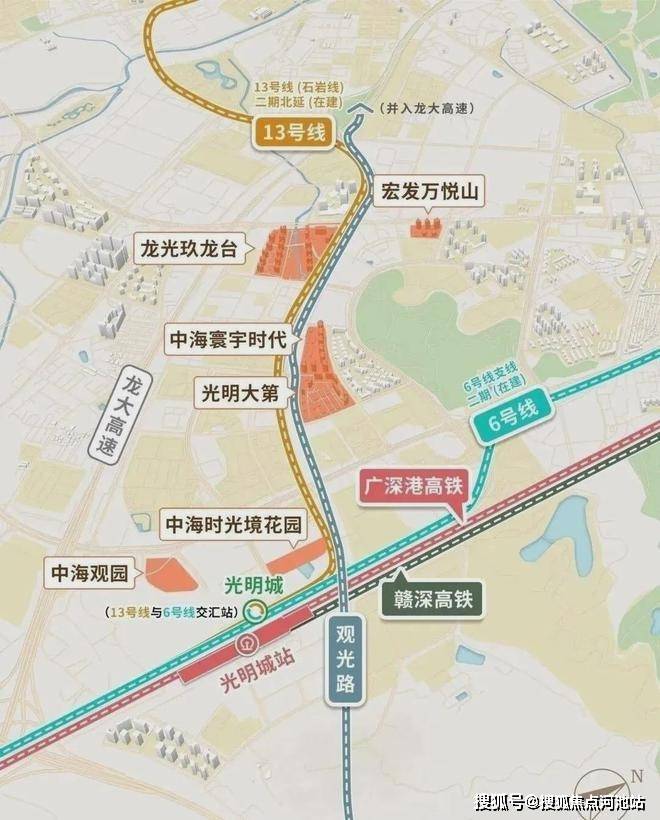 距离在建的13号线同观路站约600米,去光明城站(高铁+地铁站)步行约500米,未来地铁去南山很便捷,出门就是主干道观光路,尅可以很快转上光明大道驱车前往中心区。