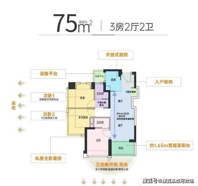 75平米三房两卫:设计的是竖厅格局,客厅3.1米开间,3个卧室分别做到了主卧9.52㎡/次卧9.47㎡/次卧8.82㎡(包含墙体飘窗),公卫带2㎡的设备平台,得房率约:95%(包含赠送),西南或东北朝向。
