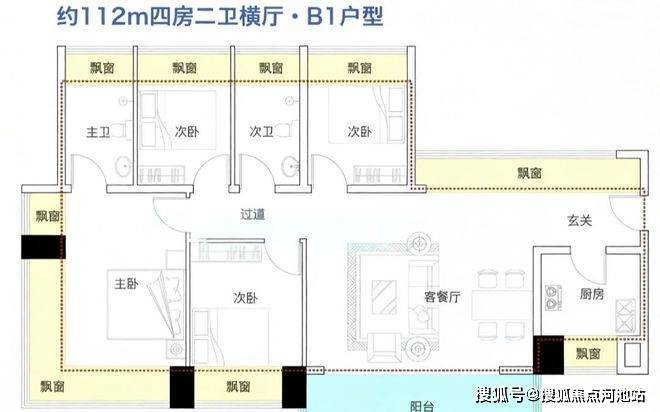 112㎡的4房2厅2卫(B1户型),设计的是横厅南北通透格局,进门入户玄关,餐客厅一体化设计,五开间朝南,全屋十面飘窗,主卧270°无柱转角飘窗,U型厨房,卫生间干湿分离,得房率约100%(包含赠送),客厅连接餐厅出大阳台西南朝向。