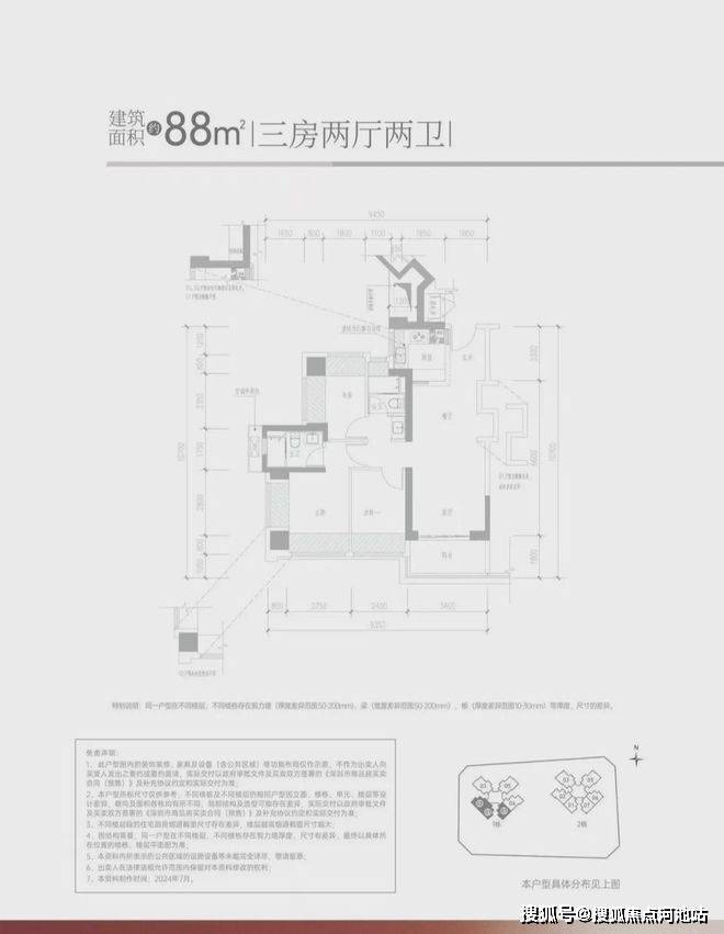 -88㎡的3房2厅2卫,设计的经典竖厅格局,客厅3.4米开间,LDKB一体化设计,S墙设计预留冰箱卡槽位,3个卧室分别做到了3.55米/2.6米/2.4米的宽度,U型厨房,公卫三段式分离设计,得房率约:95%(包含赠送),阳台进深1.8米,有西南或东南朝向。