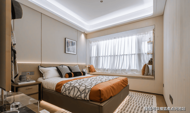 主卧双面飘窗,采光通透,尺度也比较阔绰。北向飘窗可以利用起来放置衣柜,2.9米开间,最大可容纳6门衣柜,再多的衣服也放得下。