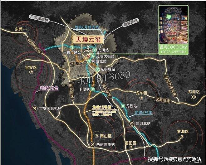 振业天境云玺毗邻光侨路、光明大道等主干道,可通过南光高速、龙大高速40分钟通达福田、南山;距离6号线光明大街站约1.3公里(步行需要20分钟),凤凰城距离约2.1公里(步行需要30分钟),其中凤凰城可换乘13号地铁线,预计2026年全线开通运营,9站到南山留仙洞,12站到南山高新园。