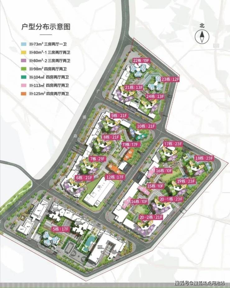 2号地块:6/7/8/9/10栋商品房21F,11/12栋商品房17F,13栋是幼儿园。