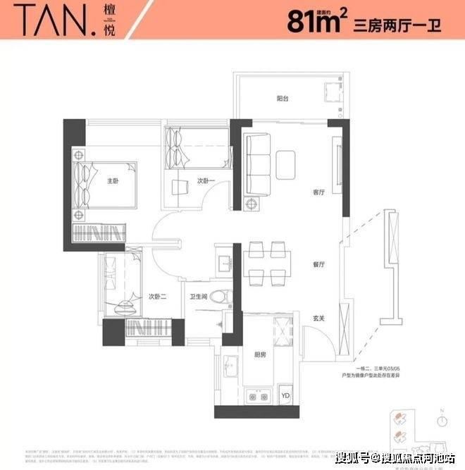 81㎡的3房2厅1卫,设计的是竖厅格局,进门入户玄关,客厅3.5米开间,LKDB一体化设计,有1个次卧做的双飘窗,U型厨房,卫生间三段式分离,得房率:74.34%(不含赠送),全部西北朝向。