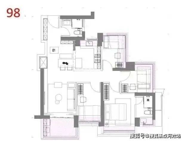 98㎡的4房2厅2卫,设计的是经典竖厅格局,进门入户玄关,LDKB一体化,S墙设计预留冰箱卡槽位,四开间朝南,有2个次卧270度飘窗,L型灵动式厨房,卫生间干湿分离,得房率约92%(包含赠送),东南朝向。