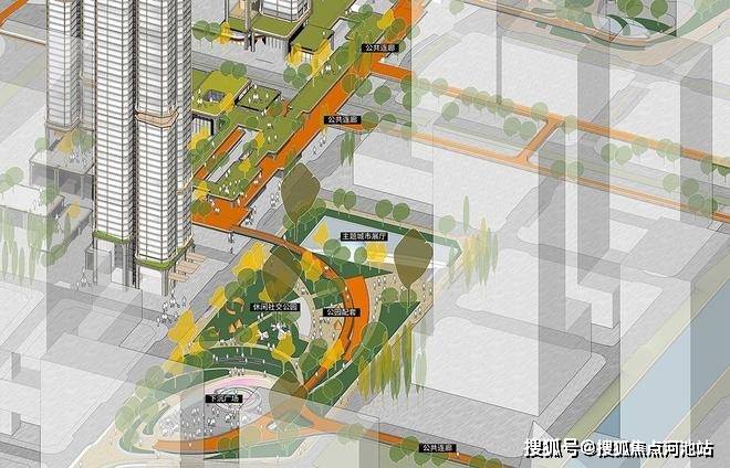 以既有空中连廊系统为基底,向北延伸公共步道,贯通南北口袋公园。整合首层、二层及地下慢行系统,形成四维立体通廊,将住区纳入更广阔的城市公共网络。