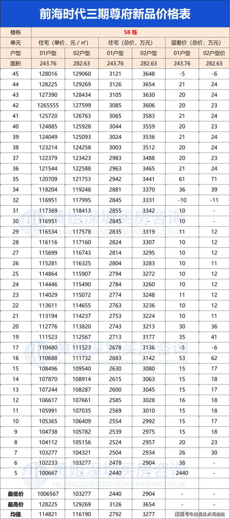 53栋价格参考,上个月推出的58栋76套约245-285㎡大平层,备案均价11.55万/㎡,总价约2440万起!将以92折开盘,折后均价10.63万/㎡。