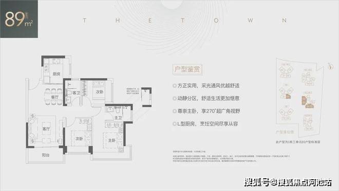 • 89㎡三房两厅两卫:经典竖厅格局,客厅3.6米开间,LDKB一体化设计,动静分区,3个卧室分别做到了3.2米、2.7米、2.5米的宽度,主卧270°超广角视野,L型厨房,卫生间干湿分离,得房率为76.33%(不含赠送),有西北或西南朝向。