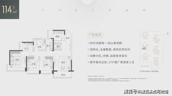 • 79㎡三房两厅一卫:竖厅南北通透格局,客厅3.6米开间,LDKB一体化设计,动静分区,四开间朝南,主卧270°超广角视野,卫生间干湿分离,得房率为76.33%(不含赠送),东南朝向。