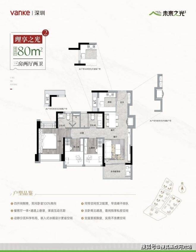 80㎡的3房2厅1卫,01.02/05/06户型,设计的是竖厅格局,进门入户玄关,四开间朝南,得房率79.4%(不含赠送),西南或东南朝向。