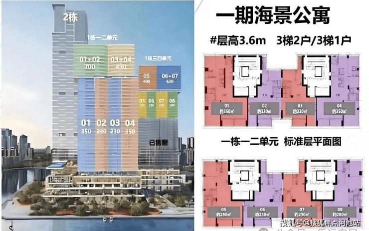 280㎡三房两厅四卫:位于1栋三、四单元24-32层,为05、08户型。拥有超8米超宽幕开间,厅出阳台可直面海景。采用三套房设计,主卧配备L形全景落地窗,占据270°最佳观海位。