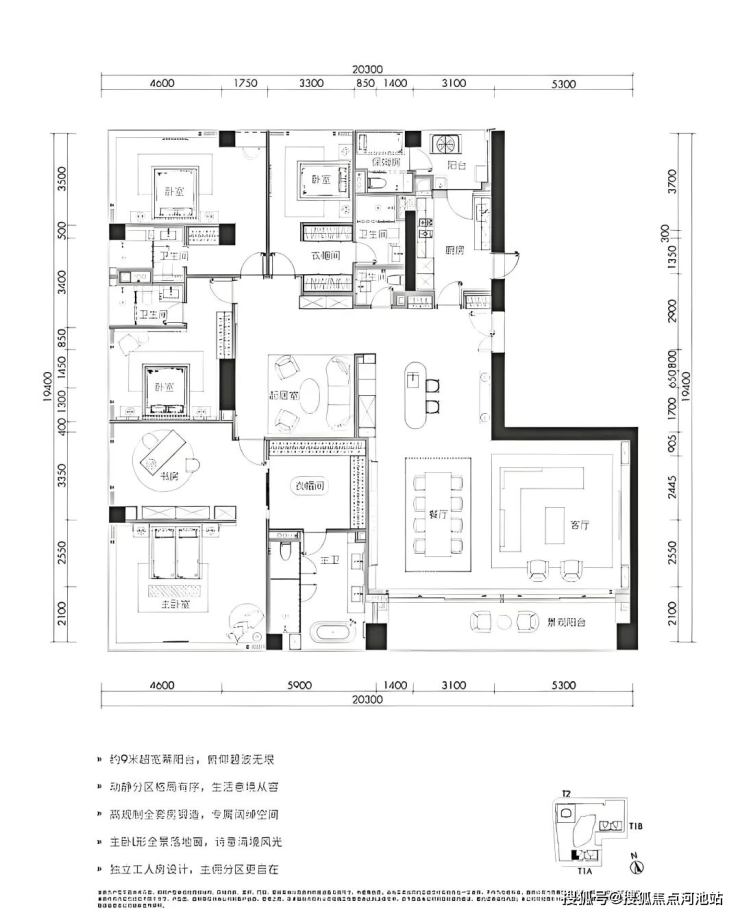 468㎡五房三厅六卫:位于1栋一、二单元高区33-38层,一层一户,仅6席。五房四套房设计,主卧L形全景落地窗,270°最佳观海位,南向超大三厅一体,动静分区布局有序。