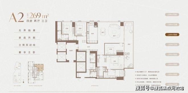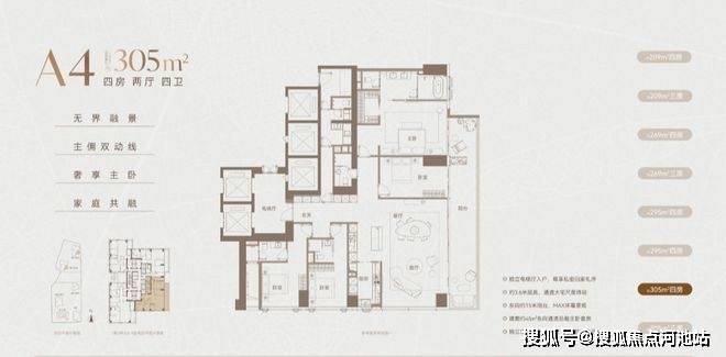 四房四卫配置,比同面积段多1个卫生间。实际反馈中,超半数看305㎡/269㎡的客户最终选择了此户型。