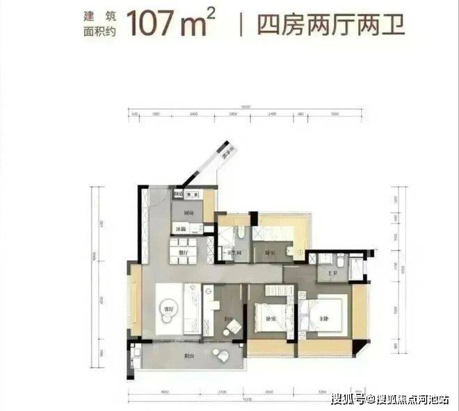 107㎡的4房2厅2卫,设计的是经典竖厅格局,客厅4米开间,LDKB一体化,S墙设计预留冰箱卡槽位,动静分区,分别做到了主卧17.18㎡/次卧11.2㎡/次卧8.64m²/次卧7.68㎡(包含墙体飘窗),U型厨房,卫生间干湿分离,得房率约79.6%(不含赠送),客厅连接次卧出10.24m²观景大阳台,东南朝向。套内面积85.19m²+赠送面积22.96m²=实用面积108.15m²,加上赠送面积后得房率101.08%。