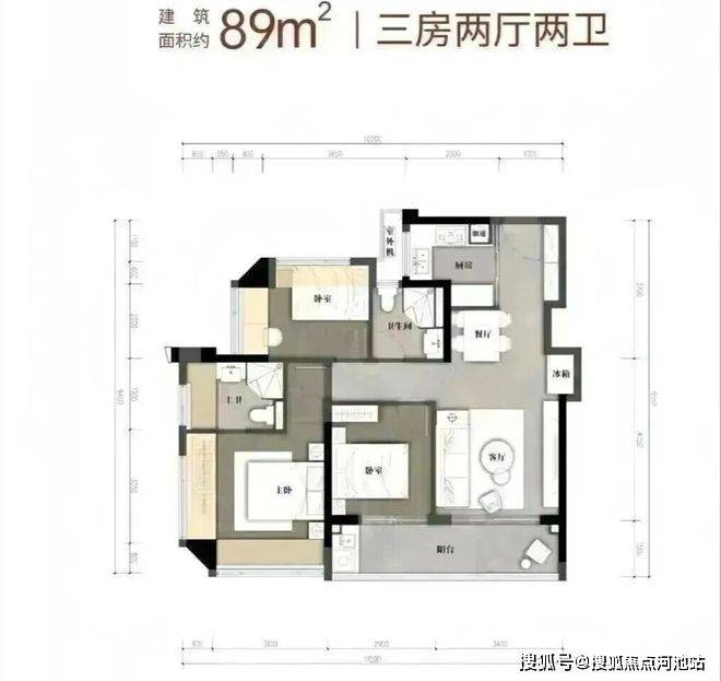 89㎡的3房2厅2卫,1栋02.03户型,设计的是经典竖厅格局,客厅3.4米开间,LDKB一体化,S墙设计预留冰箱卡槽位,动静分区,分别做到了主卧16.28㎡/次卧9.53㎡/次卧9.42㎡(包含墙体飘窗),U型厨房,卫生间干湿分离,得房率约79.6%(不含赠送),客厅连接次卧出9.45m²观景大阳台,西南朝向。套内面积70.43m²+赠送面积14.58m²=实用面积85.01m²,加上赠送面积后得房率96.1%。