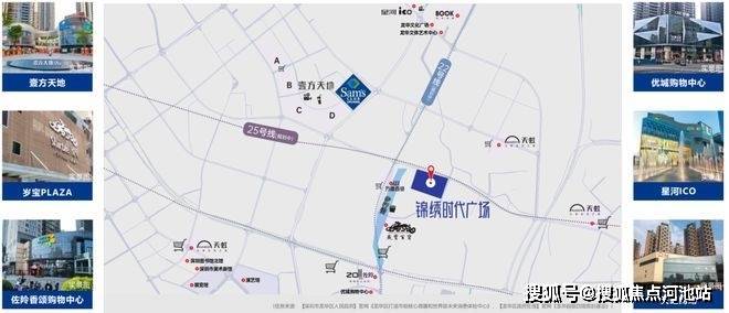在商业配套方面,锦绣时代广场紧邻壹方天地,这里有众多的购物MALL和丰富的娱乐设施。此外,项目周边还有星河ICO、绿景左阾香颂、岁宝PLAZA、天虹商场、优城购物中心等多个购物场所,满足生活所需。