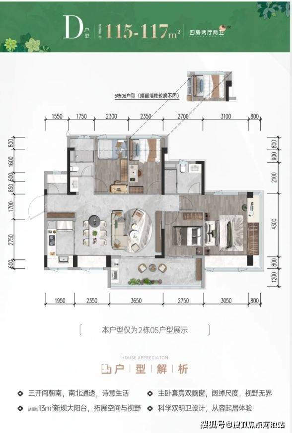 05户型117㎡4房2卫:均价5.22万,总价区间552-629万。